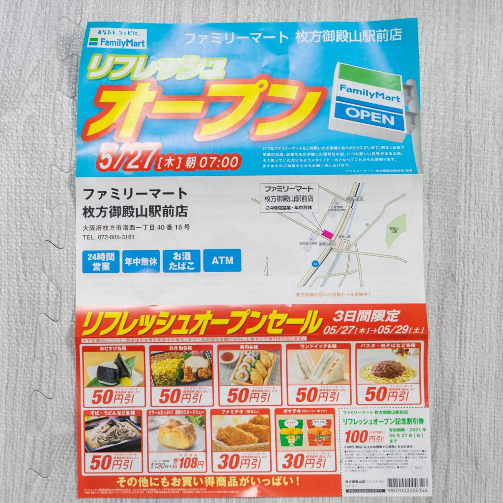御殿山駅前の「ファミリーマート 枚方御殿山駅前店」がリフレッシュオープンしています。