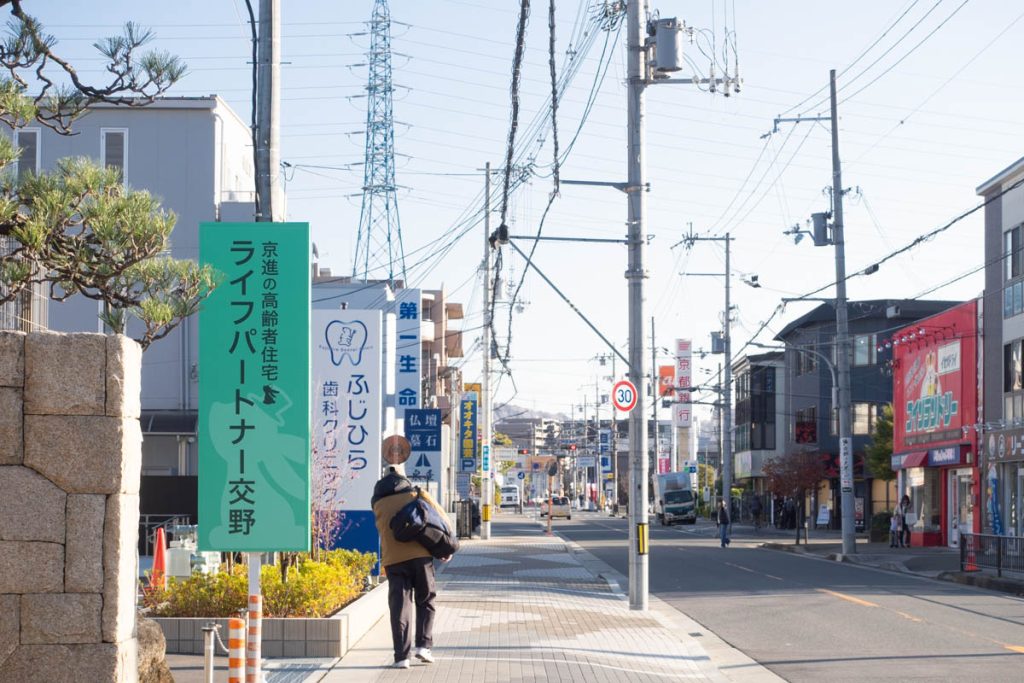 こっちに3分程歩くと、交野市駅が。反対側には「キリン堂 交野店」 などがあります。