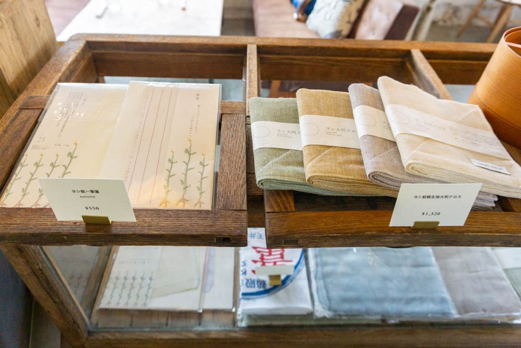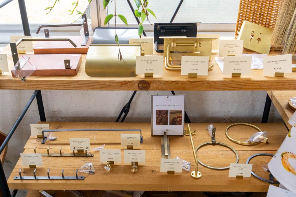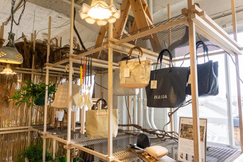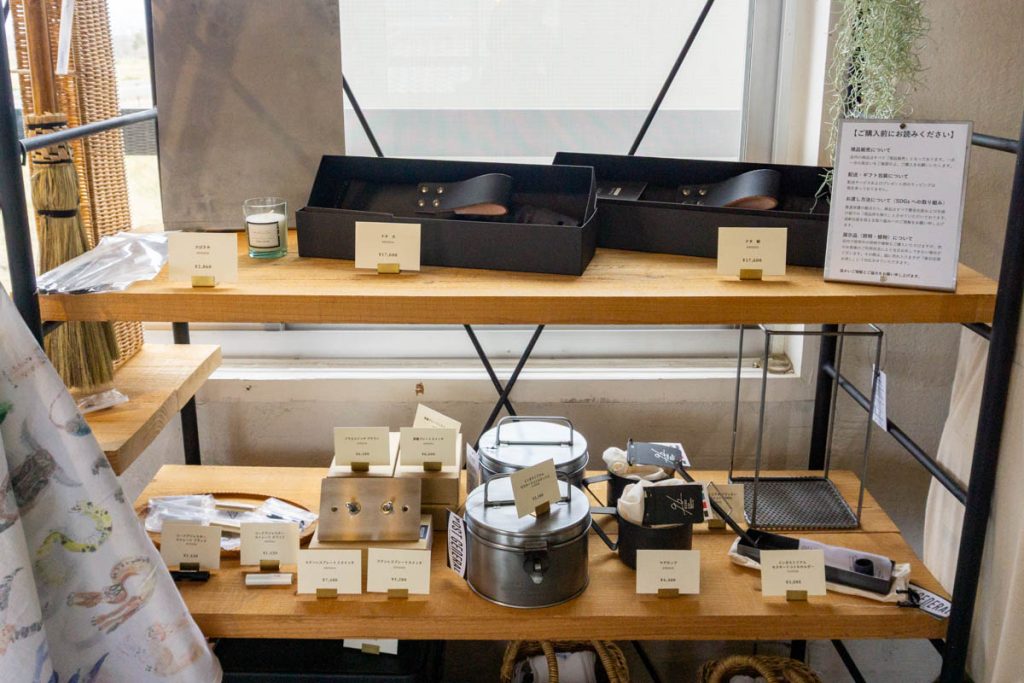 日用品、バッグ、インテリア、キャンプ用品などの取り扱いが。店内の照明も販売されていました。
