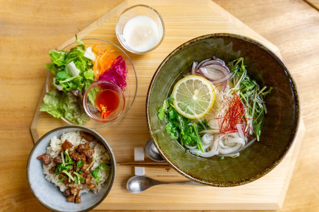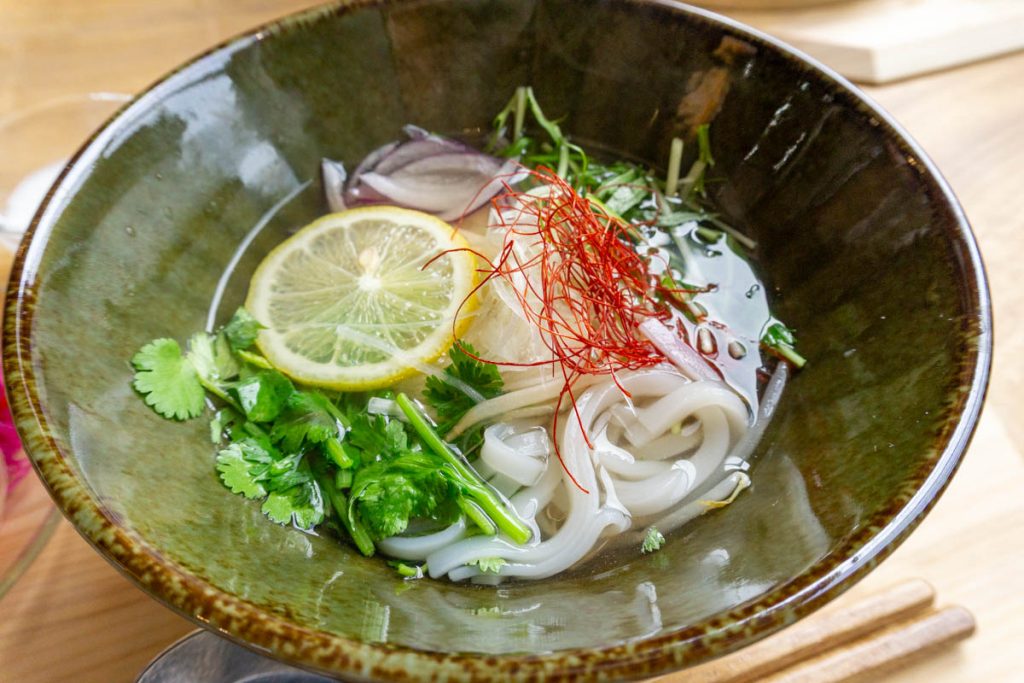 チキンフォーはパクチーありorなしが選べます。鶏の出汁がしっかり効いたスープにツルッとしたフォー、野菜のシャキシャキ食感にパクチーの独特の風味がめちゃくちゃ合う!