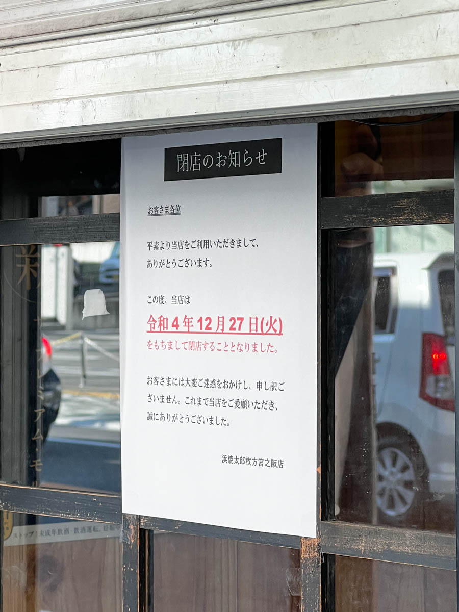 宮之阪の「浜焼太郎 枚方宮之阪店」が閉店しています。