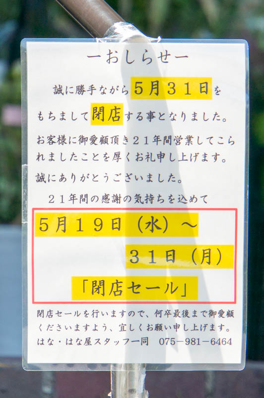 洞ヶ峠にある花屋「はな・はな屋」が5月31日で閉店するようです。