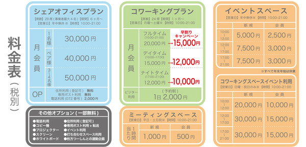 ひらば会員(コワーキング・シェアオフィス会員)は1時間あたり半額の500円です。(全て税別)