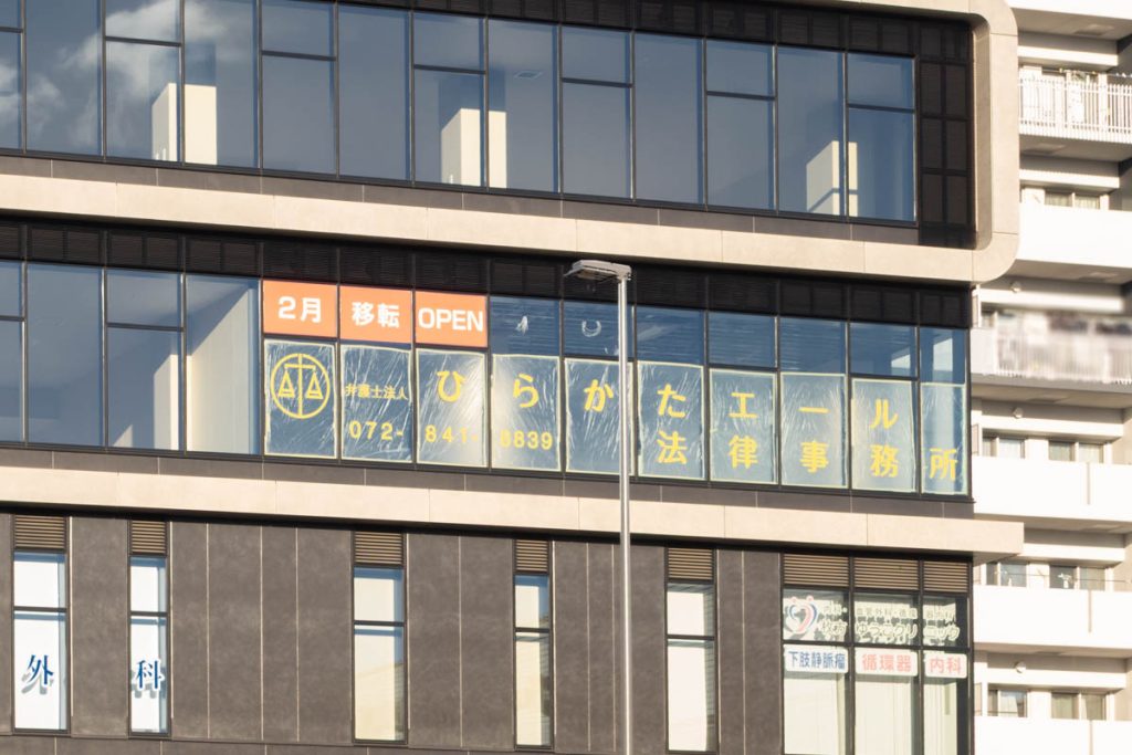 4階部分の窓に「弁護士法人ひらかたエール法律事務所」の貼紙があり、2月に移転オープンするということが書かれています。