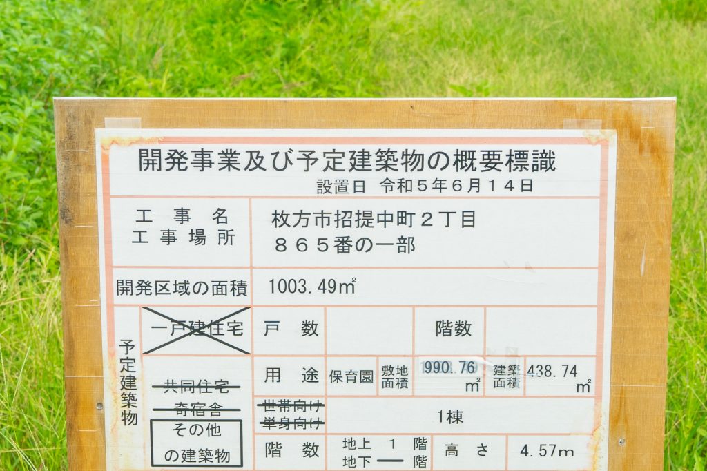 現地の概要標識から、1階建ての保育園であることがわかります。開発者をみると、日本コイノニア福祉会になっていたので枚方市内でいうと、中宮まぶね保育園やハレルヤ保育園などの系列でしょうか。