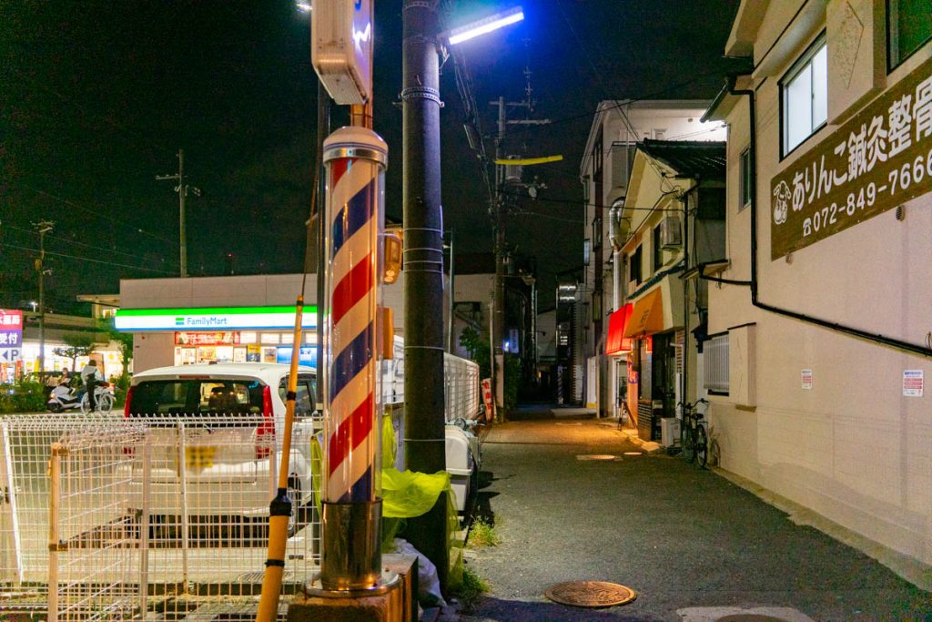 右にお店、左にファミマ。ファミマ横の細い路地に店舗があります。こっちにいくと、さらに細い道が。