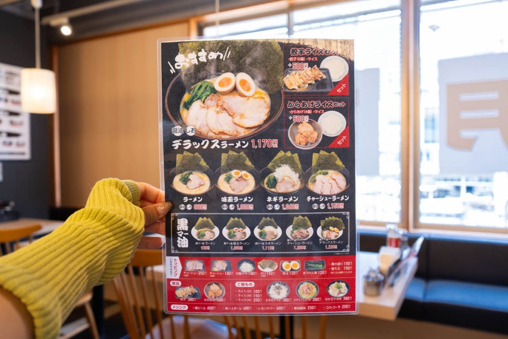 メニュー。ちなみに注文方法はタッチパネルで先に食券を買うスタイルでした。トッピングも豊富!