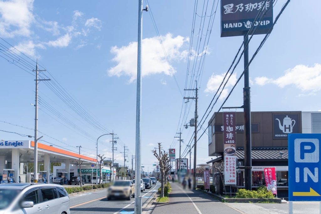 反対方向に行くとガストやセブンイレブンが。道を挟んだ向かいにはオープン予定のラ・ムー。
