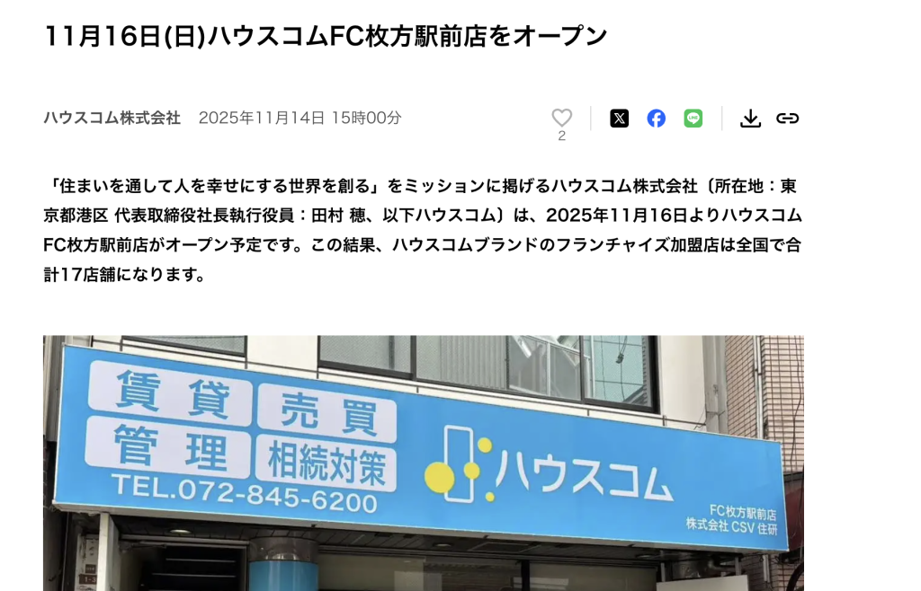PR TIMESのリリースによると、11月16日にオープンしたとのこと。ハウスコムブランドのフランチャイズ加盟店は全国で合計17店舗になるということも書かれています。