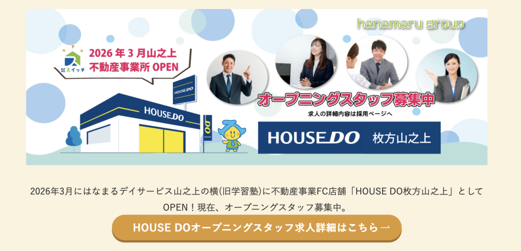 「株式会社スイッチ」公式サイトによると、2026年3月オープン予定のよう。「はなまるデイサービス山之上の横(旧学習塾)に『HOUSE DO枚方山之上』としてOPEN」とも書かれています。