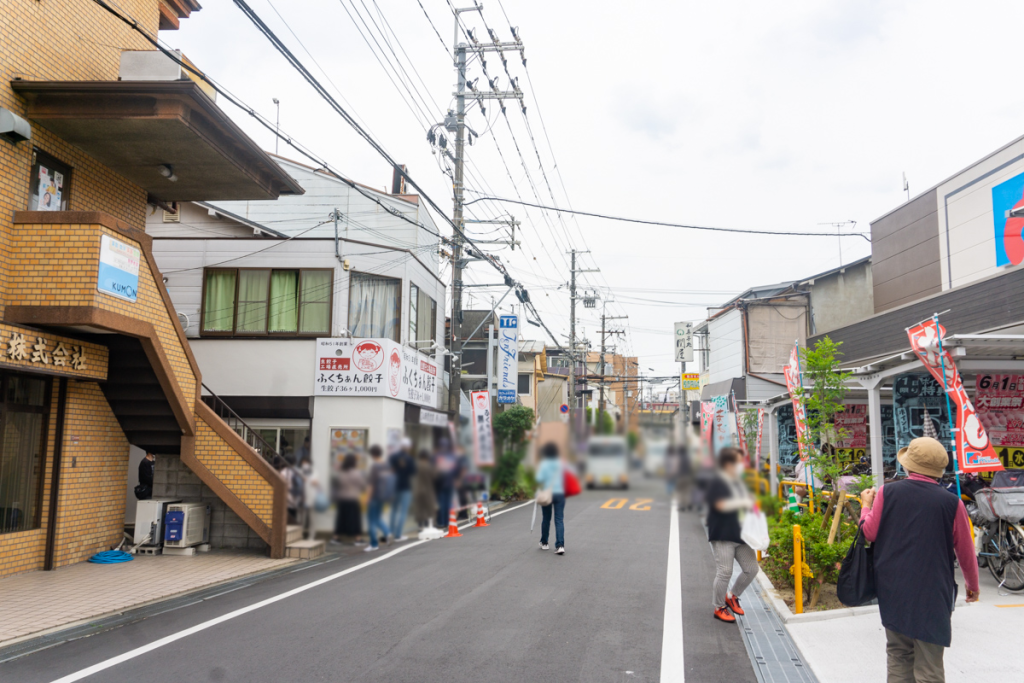 反対方向に行くといろんなお店がある西禁野の大通りが。交差点を左へ行くと府道144号線に合流できます。