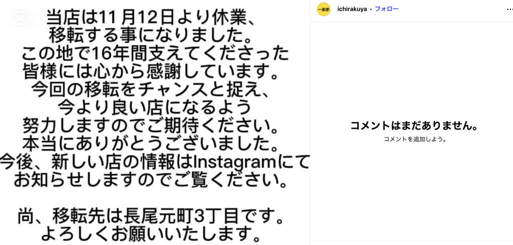 一楽家のInstagramの投稿を見てみると、11月12日から休業していることと、移転するということが書かれていました。移転先は長尾元町3丁目とも記載されています。