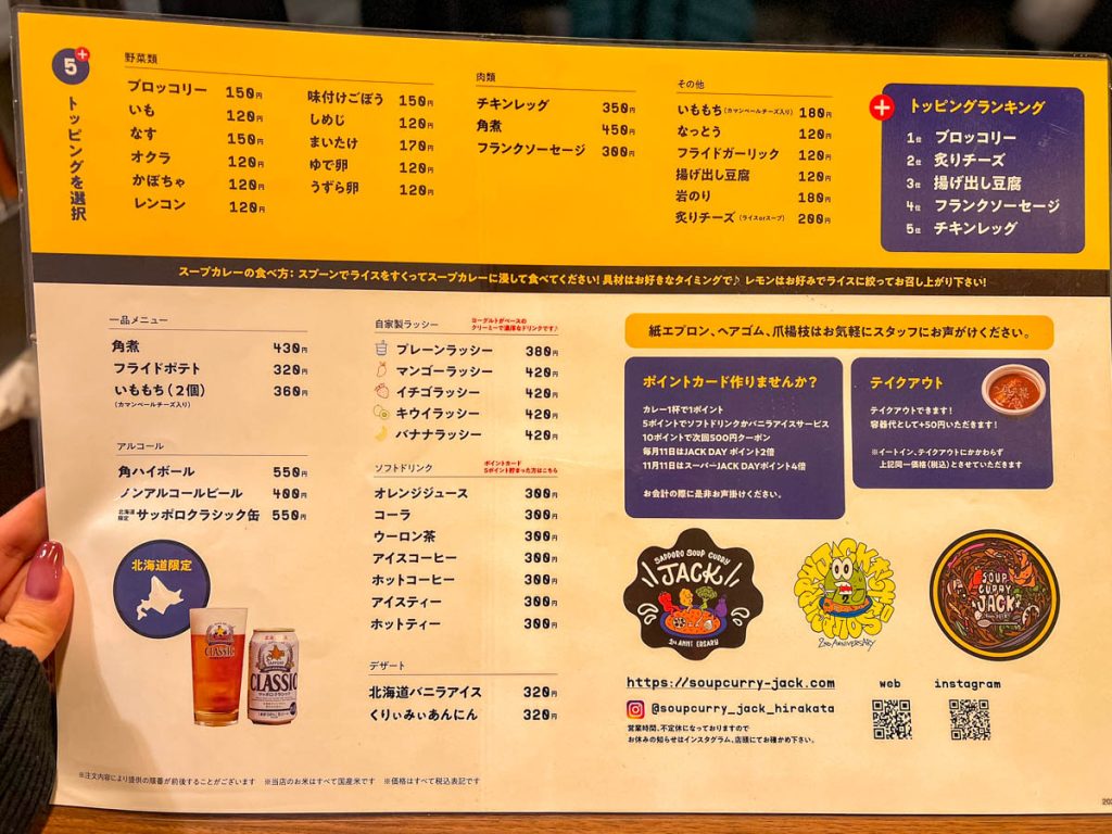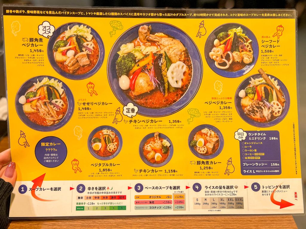 カレーは辛さが選べたり、ベースのスープもいろいろとあるようです。また、トッピングもたくさん。