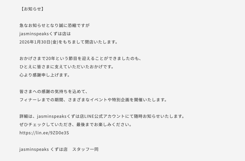 ソースはくずはモール公式サイト。内容を見てみると、「Jasmin Speaks くずは店」は1月30日をもって閉店するということが書かれています。