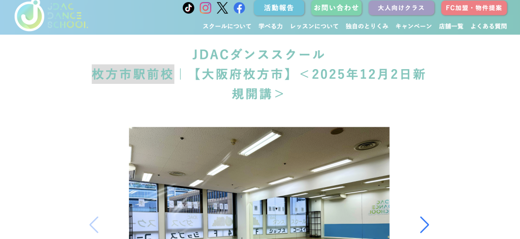 「JDACダンススクール」は全国各地にある教育型ダンススクールで、店舗一覧のページによると近隣には門真市にもスクールがあるようです(→公式サイト)。