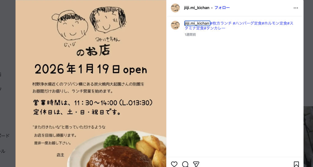 お店のInstagramを見てみると、炭火焼肉大起園の別館を昼間の時間帯のみ間借りしてランチ営業を始めるということが書かれています。定休日は土日祝とのこと。