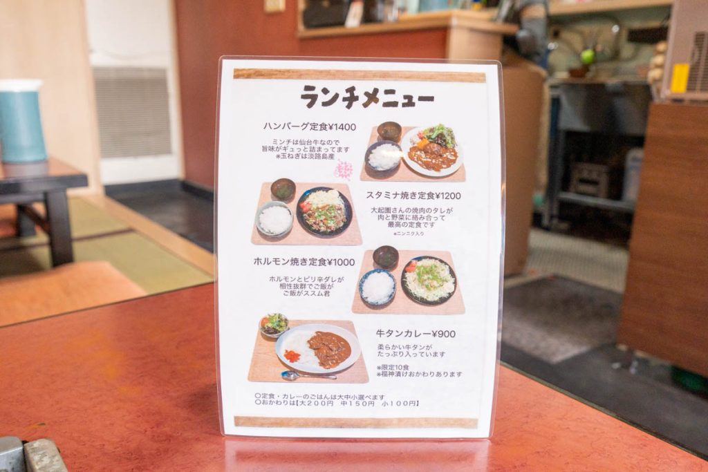 メニュー。おすすめはハンバーグ定食とのこと。仙台牛と淡路島産の玉ねぎを使った、旨味がギュッとつまったこだわりのハンバーグなんだそう!