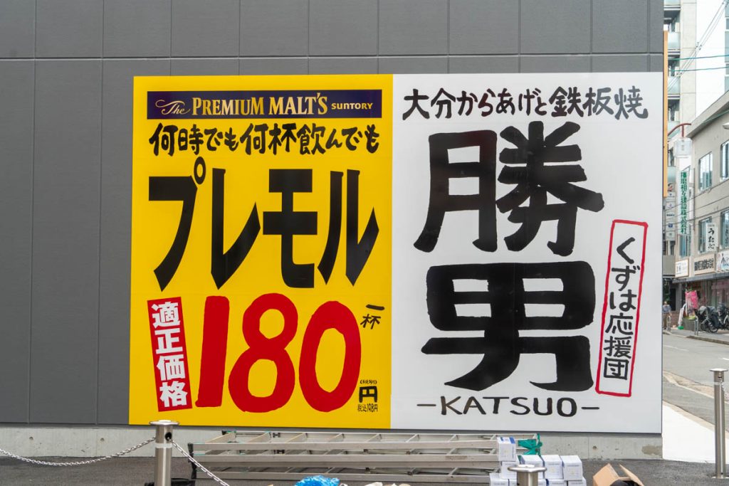 「大分からあげと鉄板焼 勝男」は、大分県のご当地グルメ『中津からあげ』やプレモルが1杯180円で楽しめる全国チェーン居酒屋。近くだと香里園駅近くや高槻にも店舗があります。