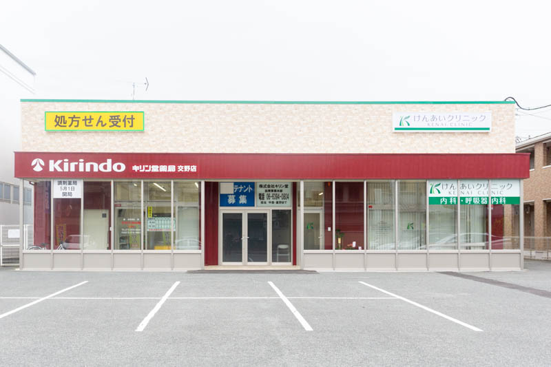 交野の交野の旧キリン堂跡地に作っていた「キリン堂薬局 交野店」と「けんあいクリニック」が開院しています。