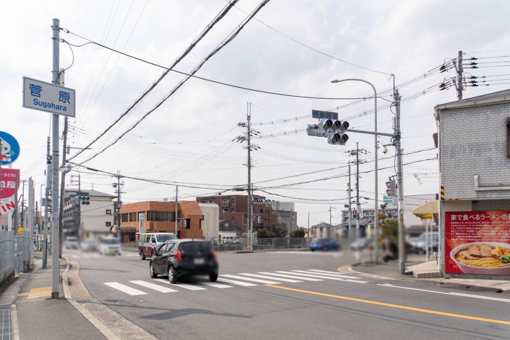 反対方向すぐ近くには西松屋が。信号を右に行くとフレストがあり、信号を真っ直ぐ行くと業務スーパーなどがあります。