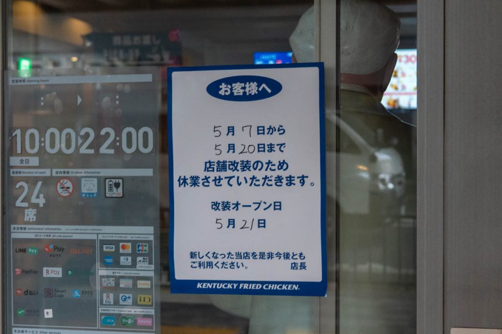 休業中の最寄りの店舗は、1号線沿い堂山東町のお店でしょうか。2週間ほどは、市駅のケンタッキーは利用できないと覚えておいては!