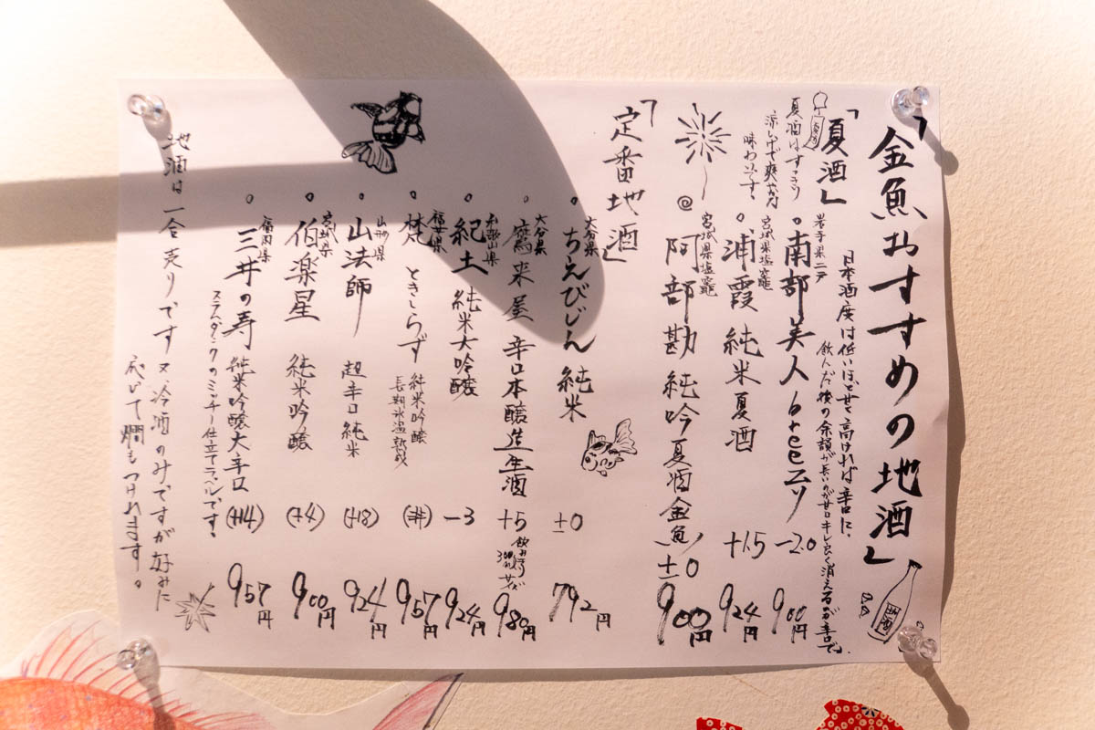 お店の名前にもあるように、店内には金魚がたくさんいます。壁にはいろんなお魚さん。