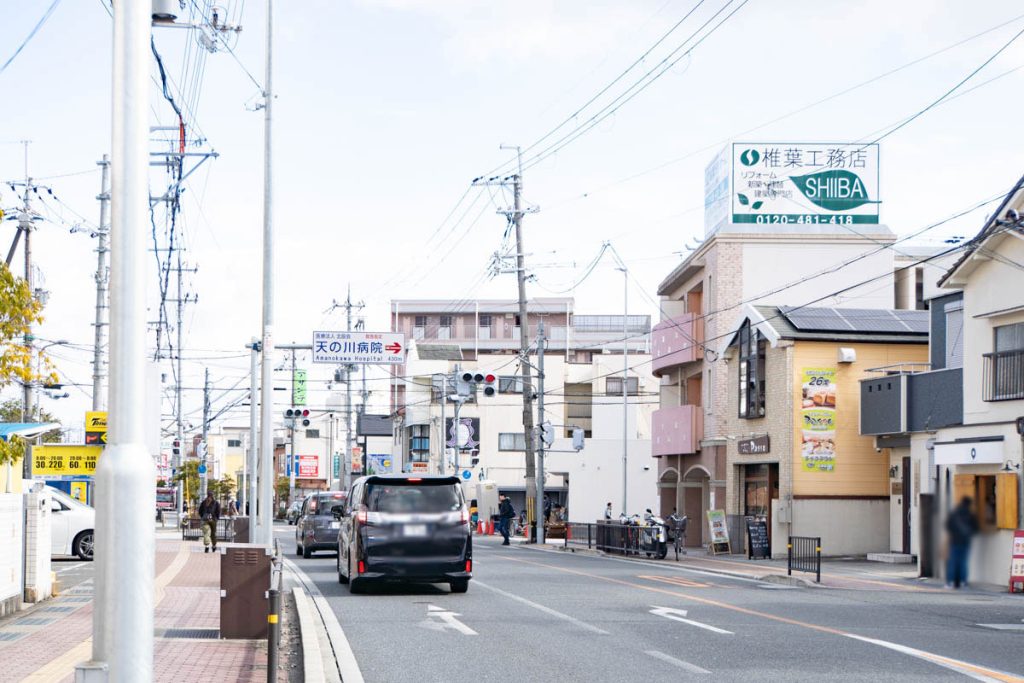 反対方向にいくとウエルシアや坂野病院などの前を通って関西外大の方へ。