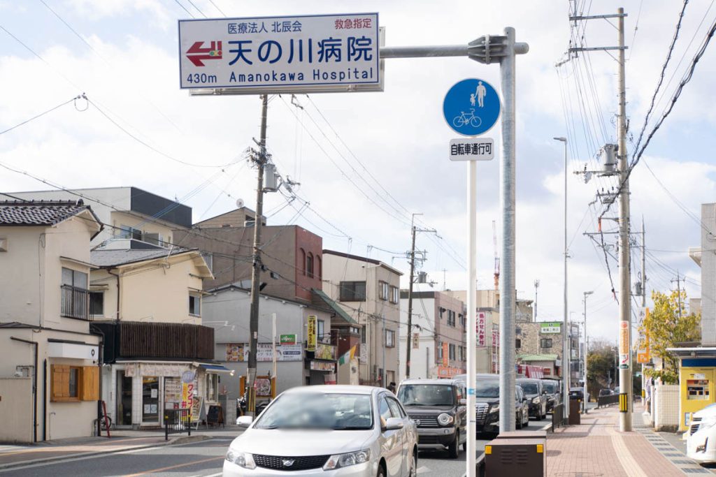 こっちにいくと市立ひらかた病院の入り口前を通って、宮之阪・枚方市駅方面へ坂道を下ります。