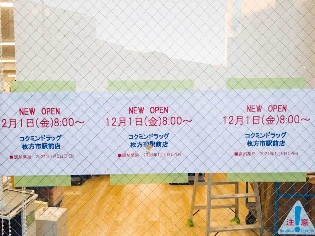 枚方市駅ちかくにできる「コクミンドラッグ 枚方市駅前店」のオープン日は12月1日のようです。
