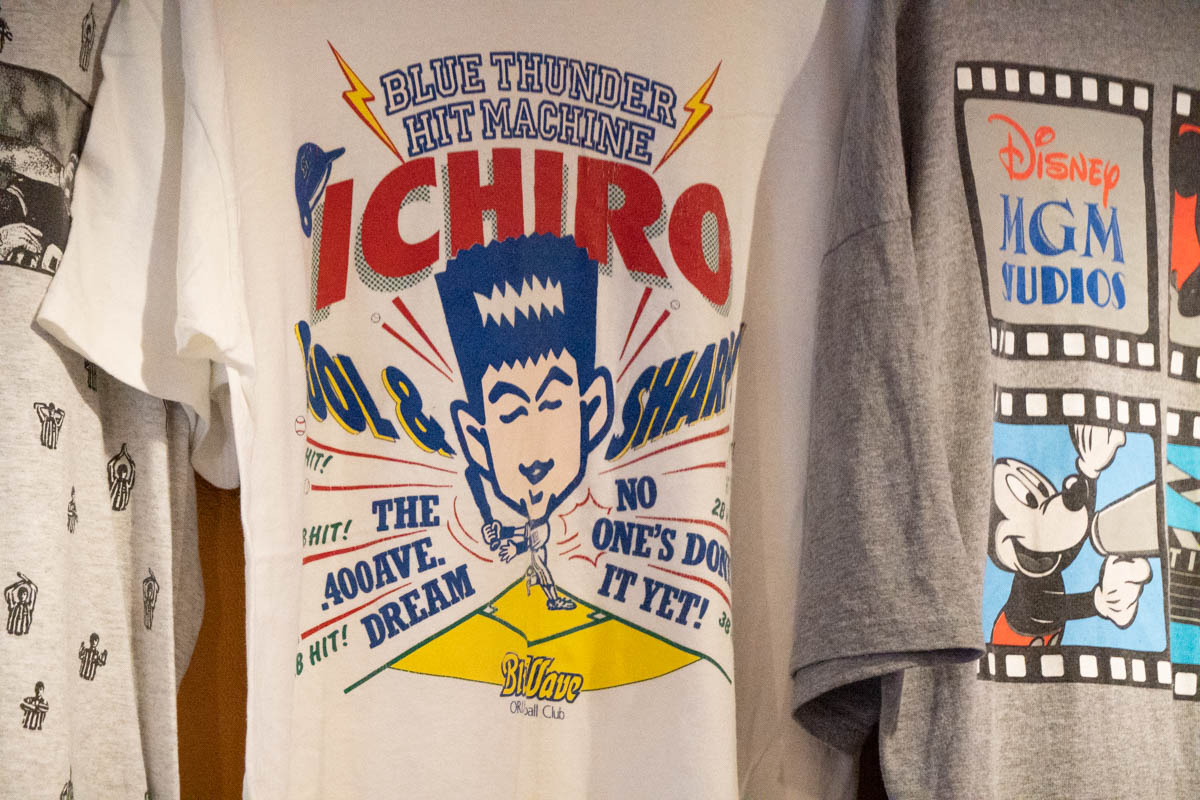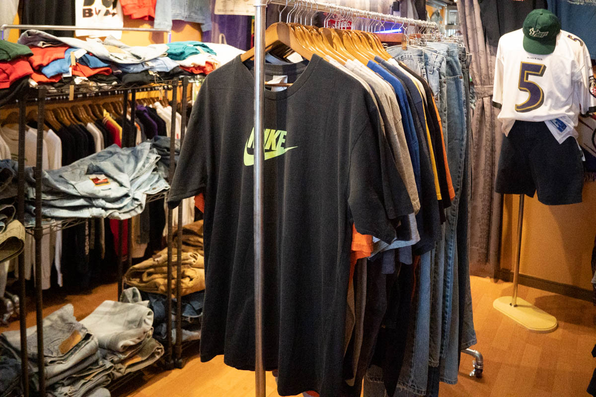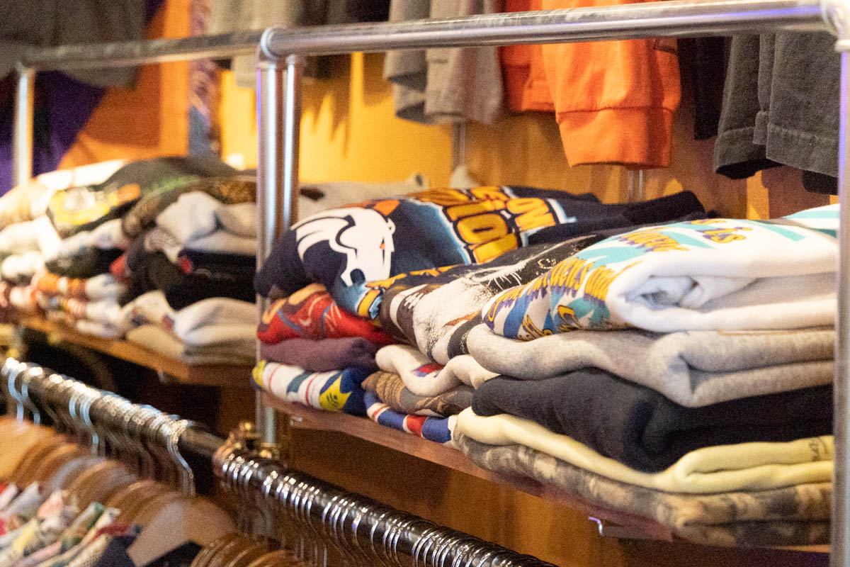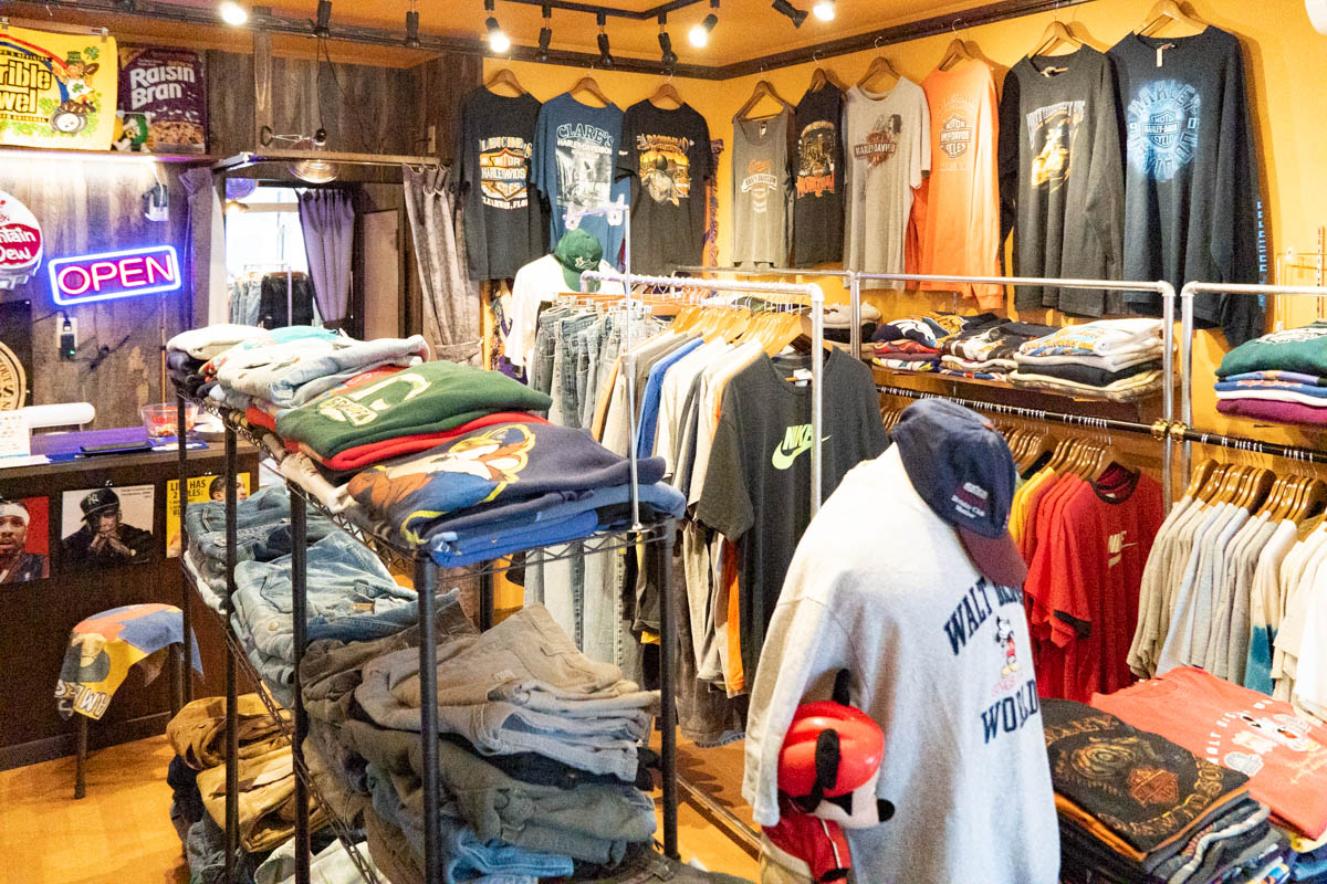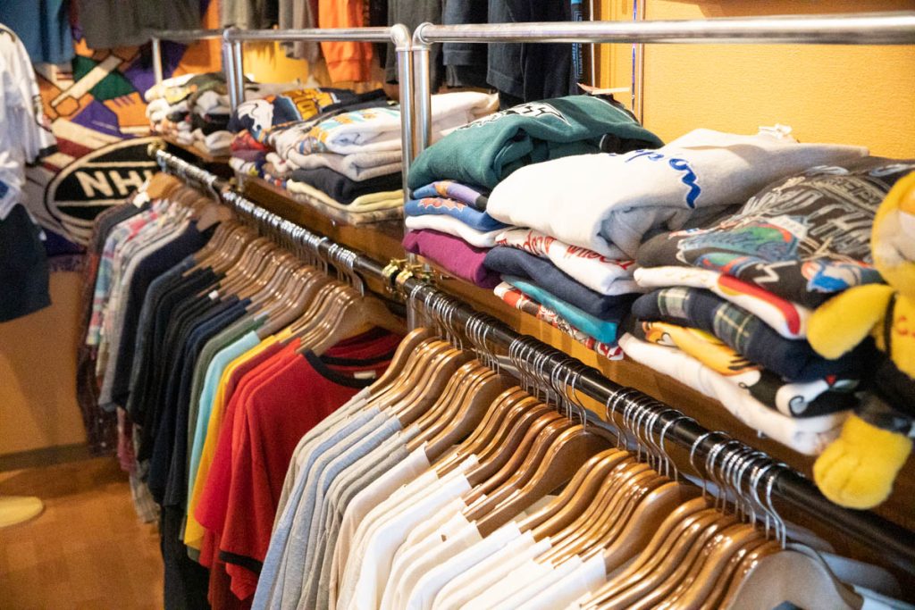 店内には古着が壁までびっしり並んでいます。パーカーからT−シャツまで、ジャンルが豊富。