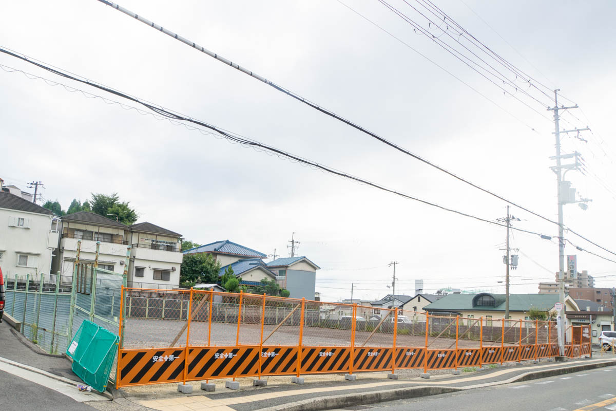 喫茶店ピノキオや夢庵と同じ敷地内にあって、奥に見えている大きな建物は交野警察署。進んでいくと機物神社の前を通って津田駅方面です。