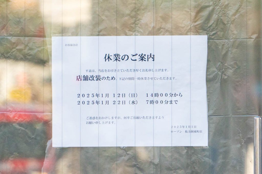 サンシャインロード沿い枚方市駅ちかくの「ローソン 枚方岡東町店」が休業しています。