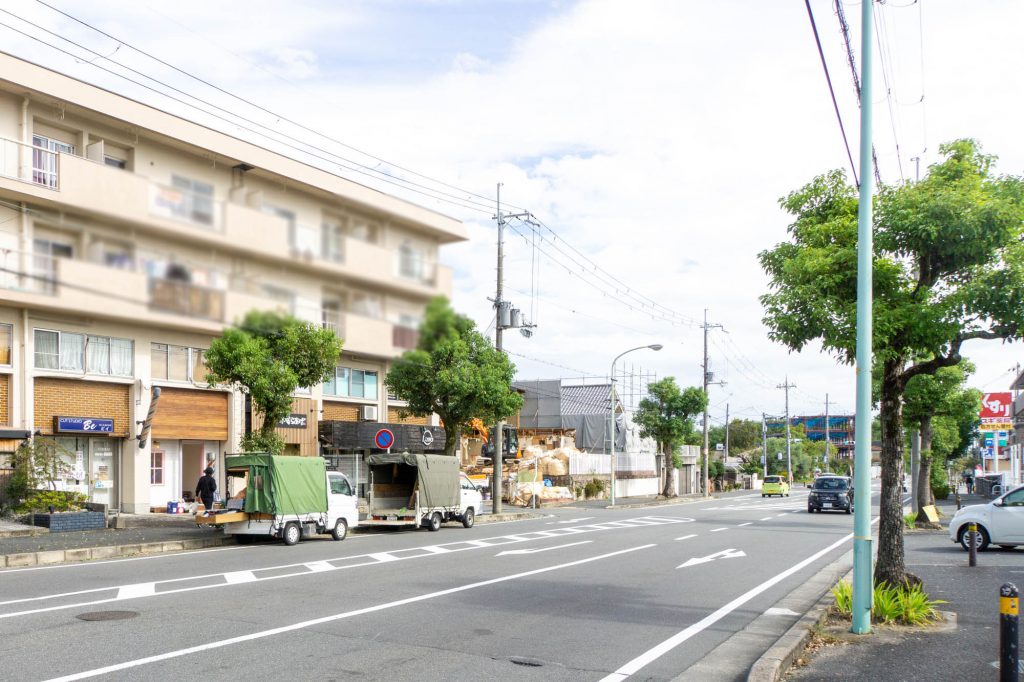 反対方向にはスギ薬局やかっぱ寿司、灯りの湯が。国道1号線方面です。