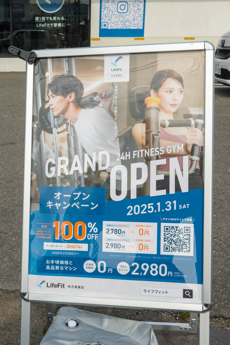 府道144号線沿い長尾谷町に作っていたジム「LifeFit(ライフフィット) 枚方長尾店」がオープンしています。