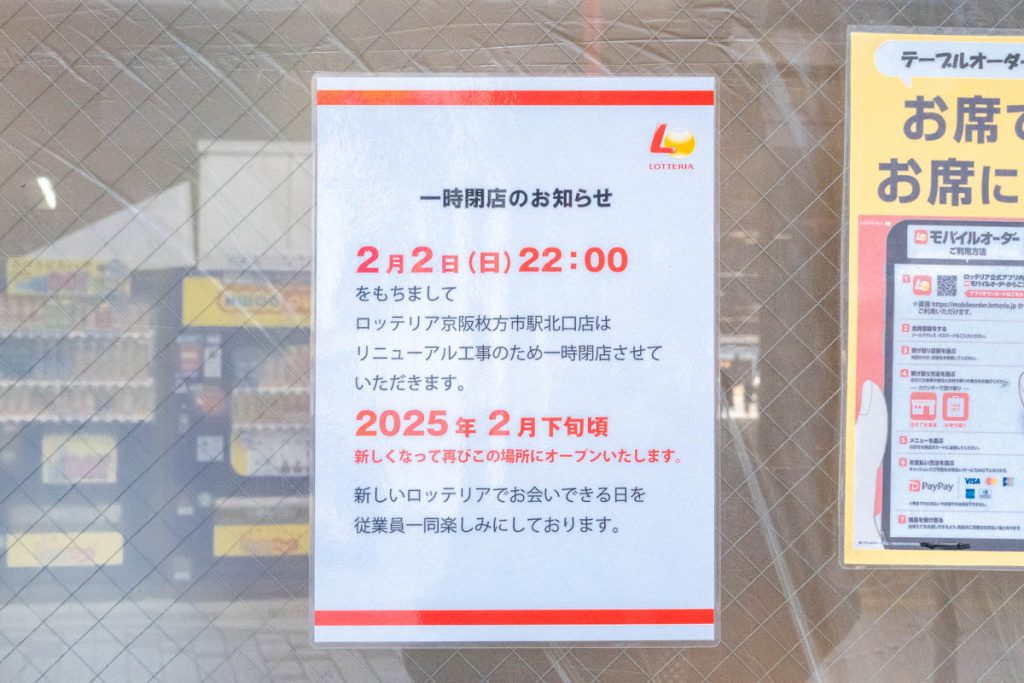 枚方市駅前の「ロッテリア 京阪枚方市駅北口」が一時閉店しています。