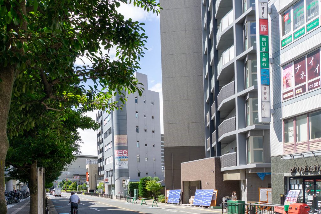反対方向へ行くと関西医科大学が。すぐ近くの交差点を左に曲がると100mを超える高さの関西医大タワーが見えます。
