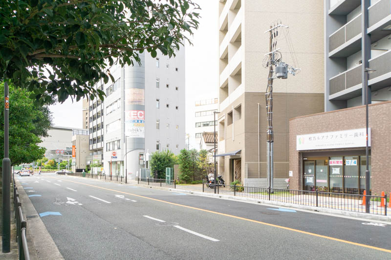 反対方向へ行くと関西医科大学が。すぐ近くの交差点を左に曲がると100mを超える高さの関西医大タワーが見えます。