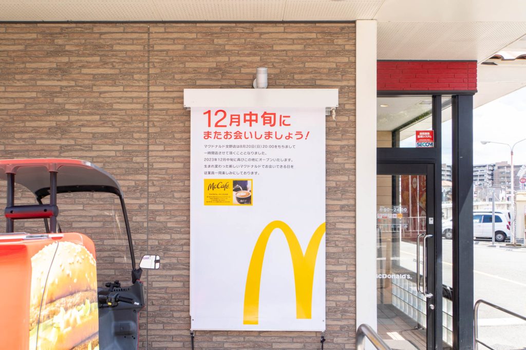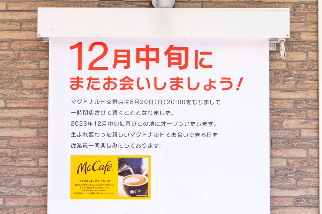 交野市駅近くの「マクドナルド 交野店」が一時閉店するようです。