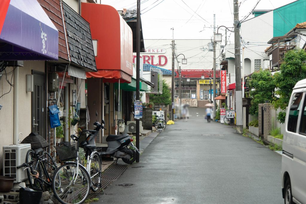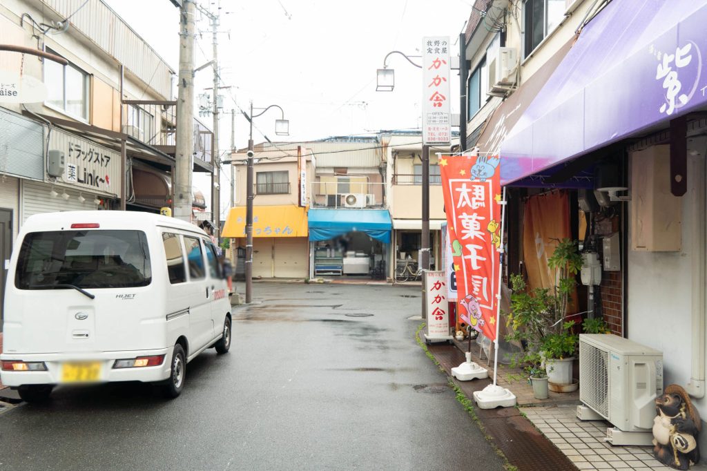 反対方向に行くと住宅など。隣には最近駄菓子の自販機が設置された「かか舎」。