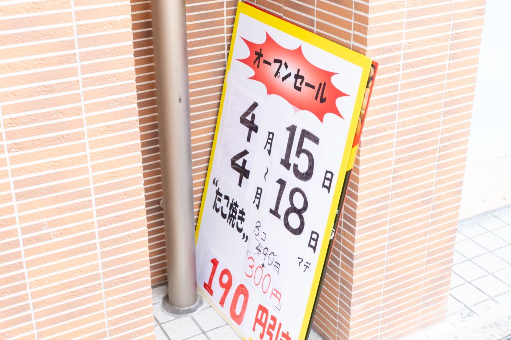 お店の前にあった看板には「たこ焼き」という記載があったので、おそらくたこ焼き店かと思われます。