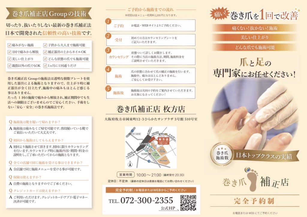 「巻き爪補正店」は、全国に多数展開している足のトラブルに特化したというフットケアサロン(→公式サイト)。枚方では初めての出店になるようです。