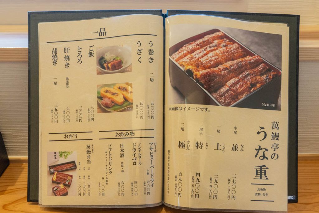 メニュー。うな丼、うな重以外にもうなぎ関連の一品が多数。