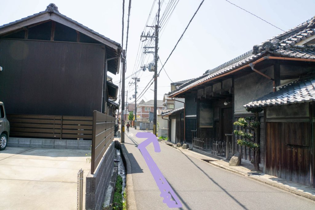 矢印の方向へ曲がりこの小道を真っ直ぐ行くと