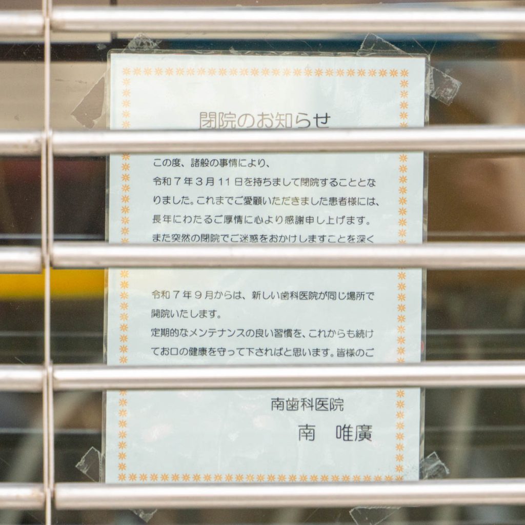 貼紙があり、3月11日をもって閉院したとのこと。9月には新しい歯科医院がこの場所に開院することもわかります。
