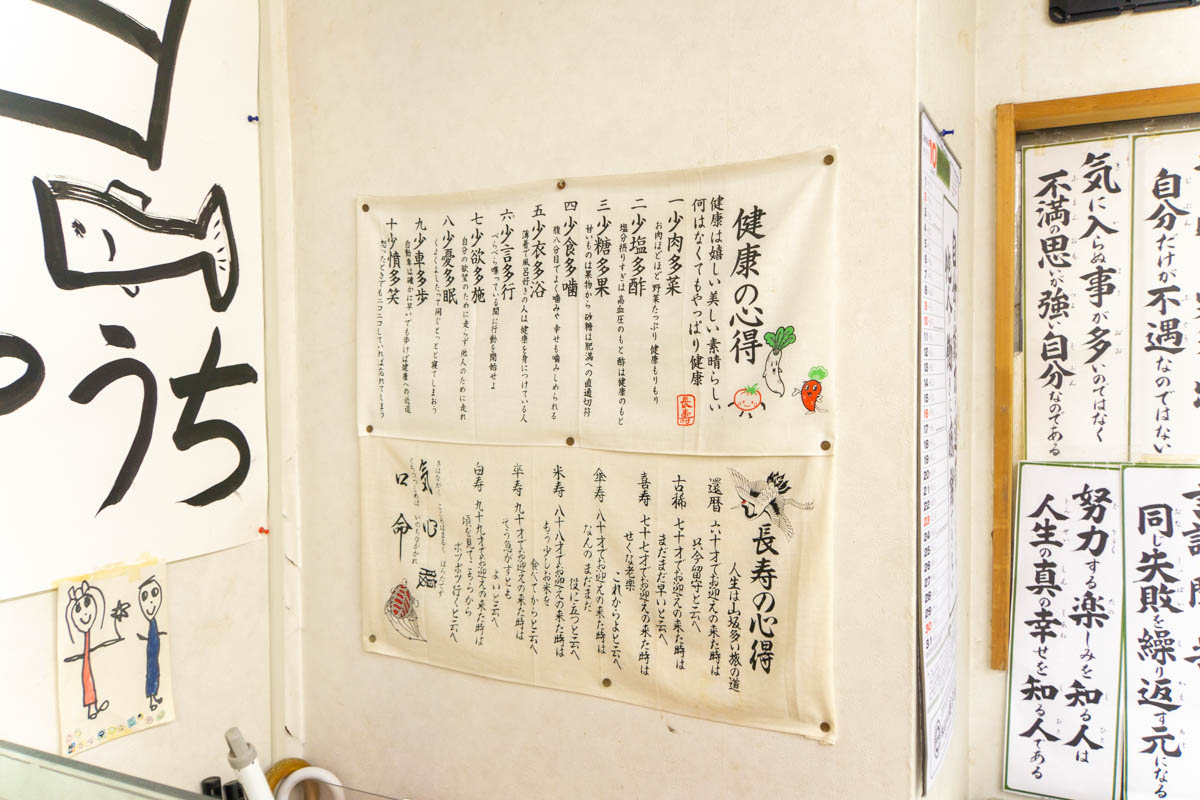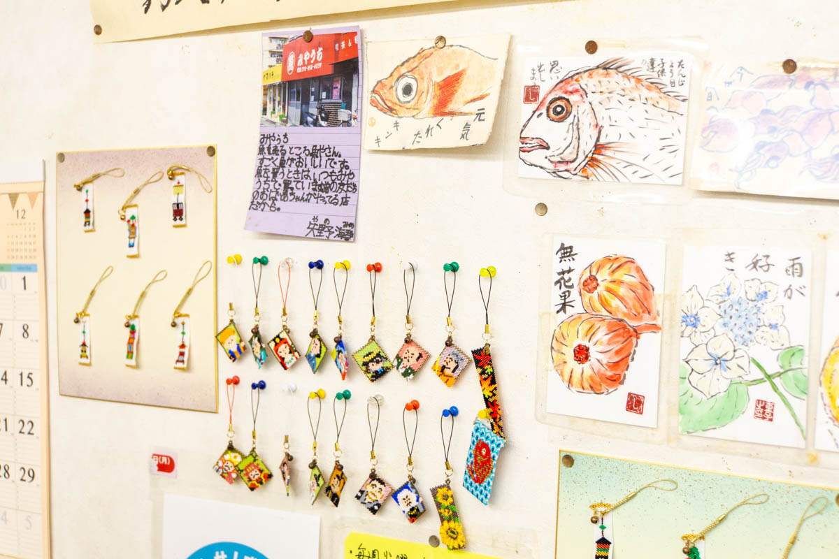 魚拓に俳句にビーズアート…お店はここの常連さんたちが持ってくる品々が飾られています。