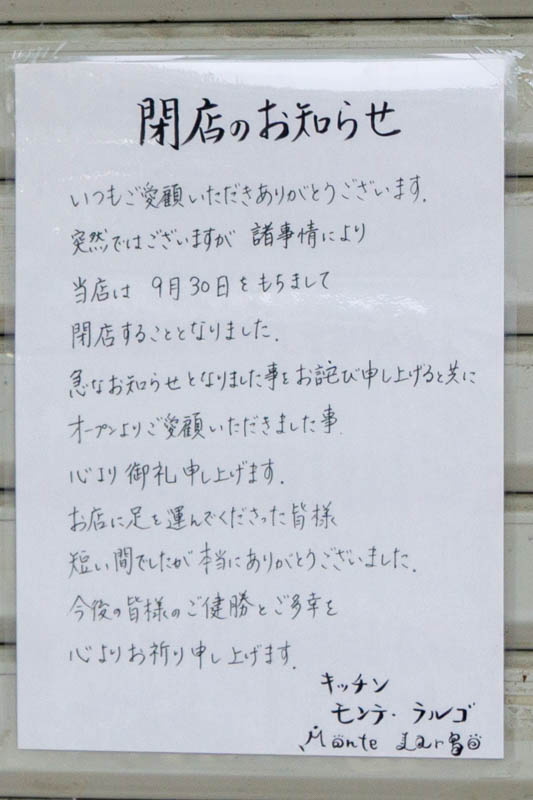 御殿山南町の洋食屋「Monte Largo(モンテラルゴ)」が閉店しています。