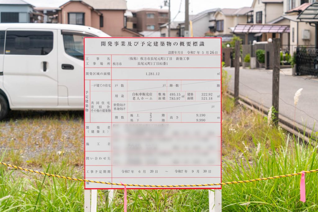 概要標識の内容を確認してみると、用途の欄に「自転車販売店」「老人ホーム」と書かれています。工事予定期間は、9月30日までとのこと。階数は、2、3階建てと書かれています。