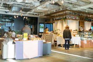 コミュニティスペースには不要になった布製品等を回収し、エタノールなどのエネルギーとして再生する企業連携プロジェクト「BRING」コーナーも。