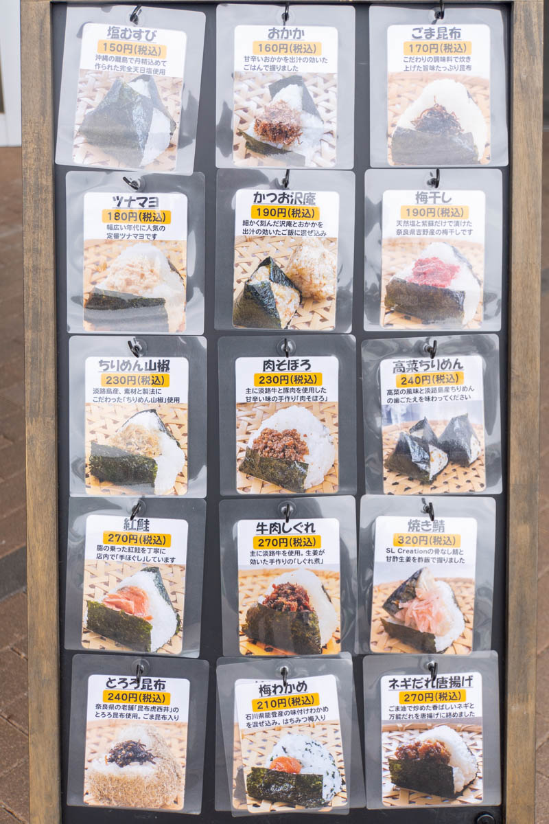 塩むすび150円や、ネギだれ唐揚げ270円といった変わり種など、種類がたくさん。
