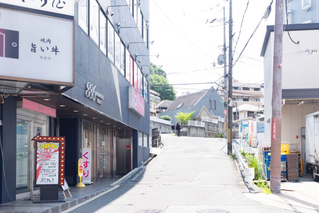 枚方公園駅を背にしながら「焼肉 旨い牛」などが入る建物と、フレスコの間の道を進んで左へ。